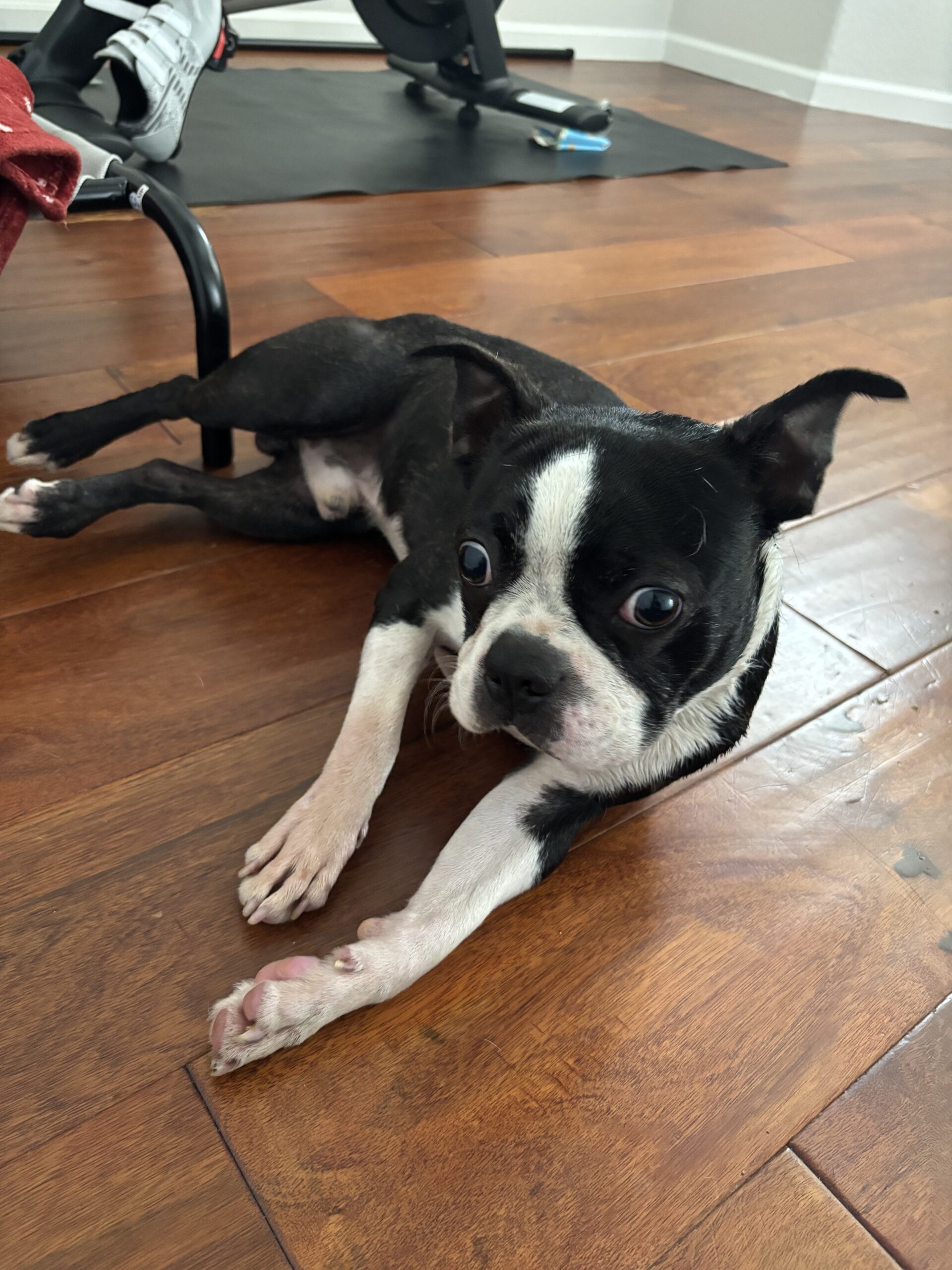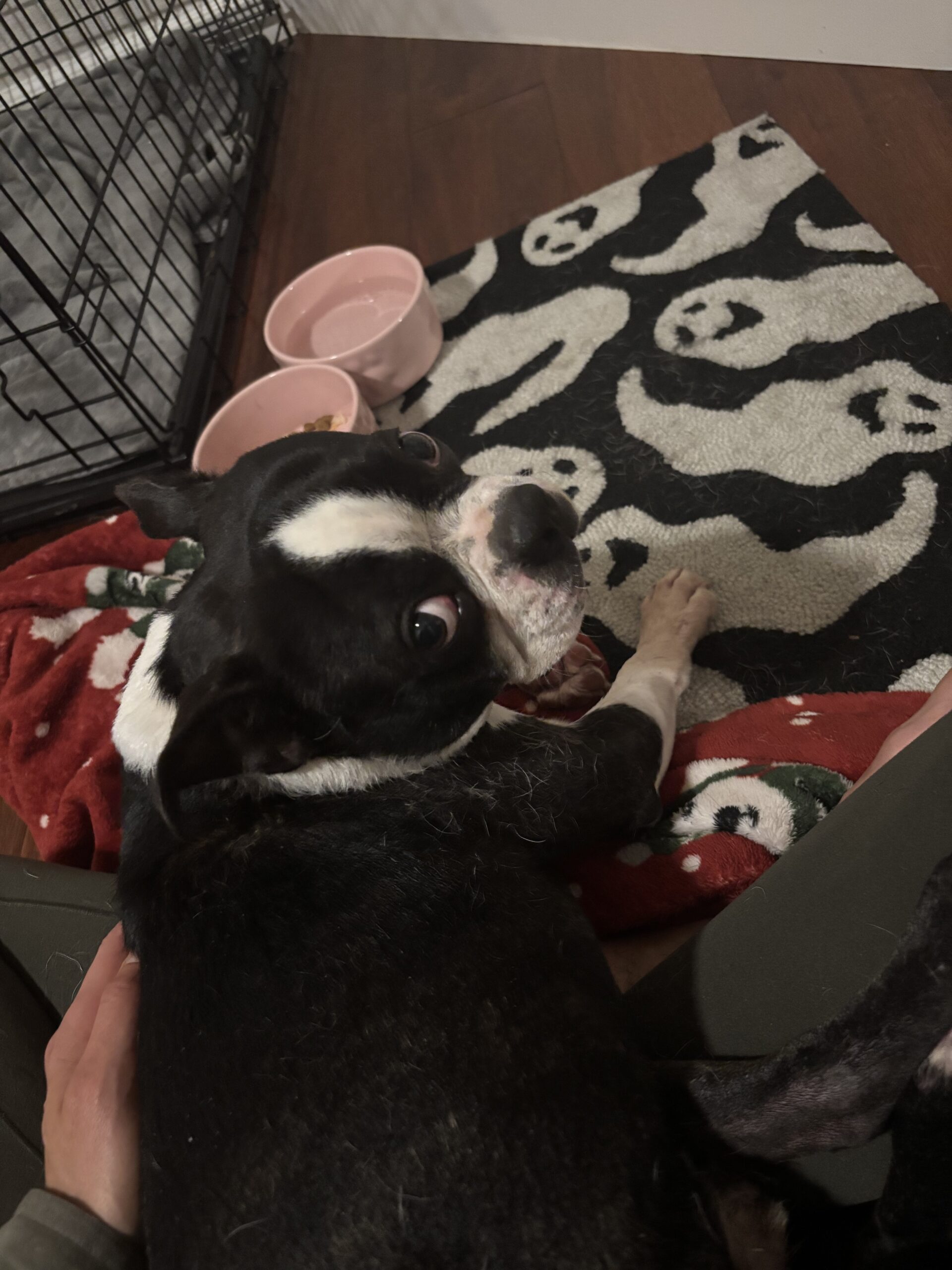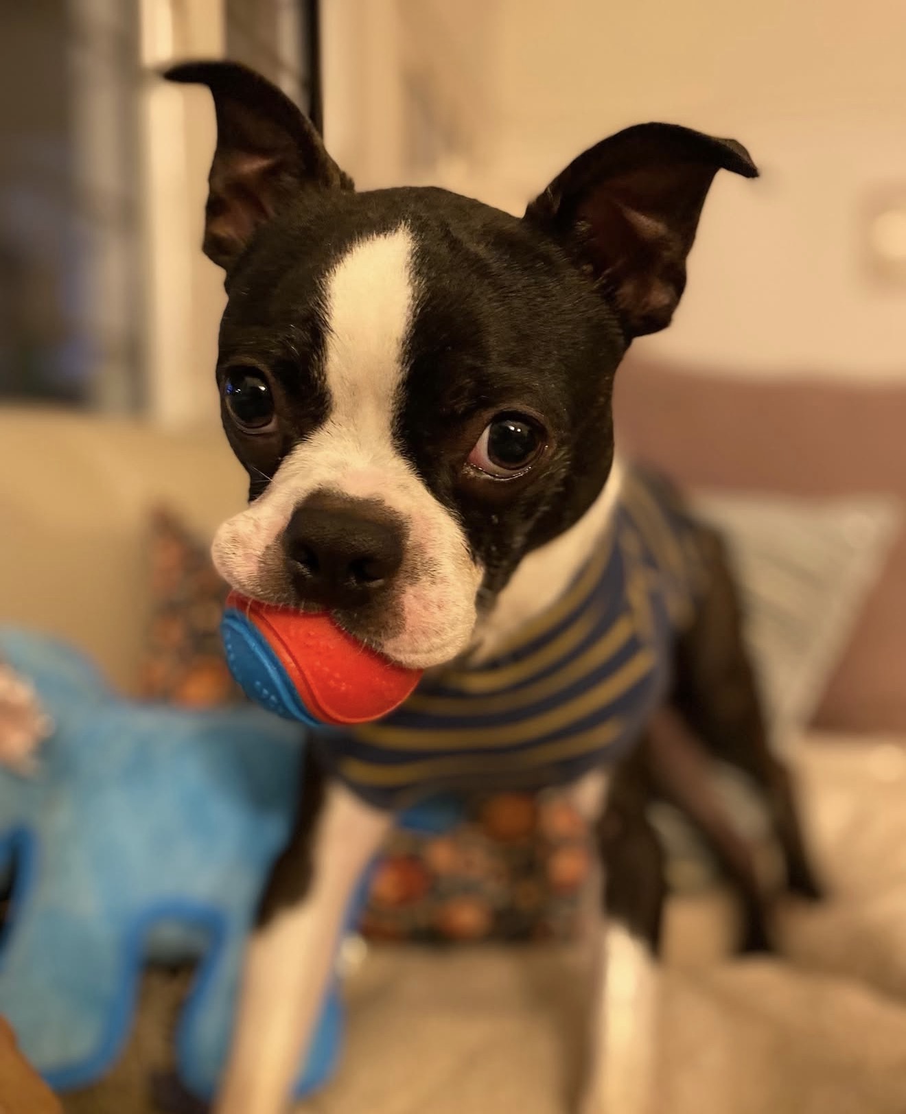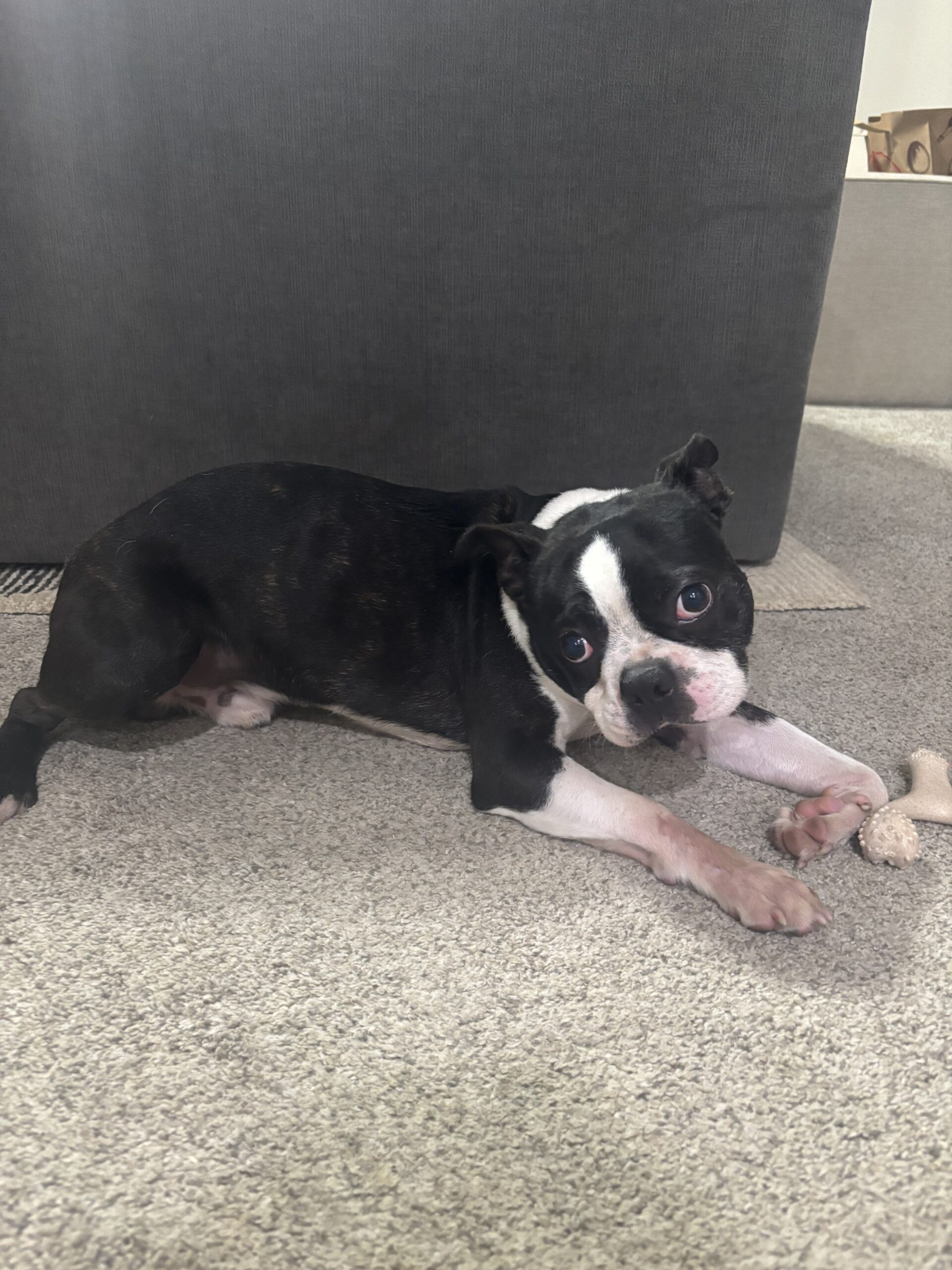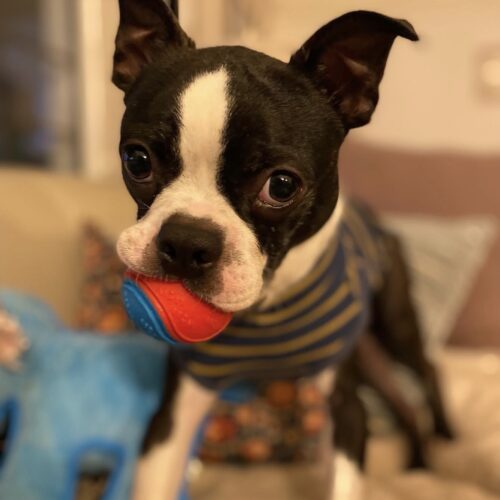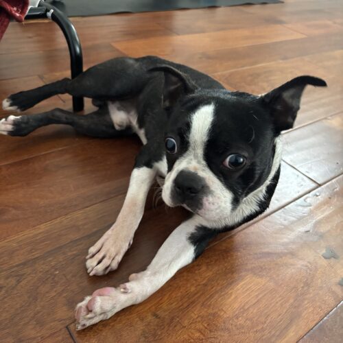 Meet Calvin, a one-year-old Boston Terrier sweetheart who’s looking for a soft place to land and a family to adore. Calvin is a little different from other dogs—he has a neurologic condition that gives him an adorable head tilt, some facial tremors, and a unique wobbly way of standing and walking. But what hasn’t changed is his gentle, affectionate, people-loving personality.