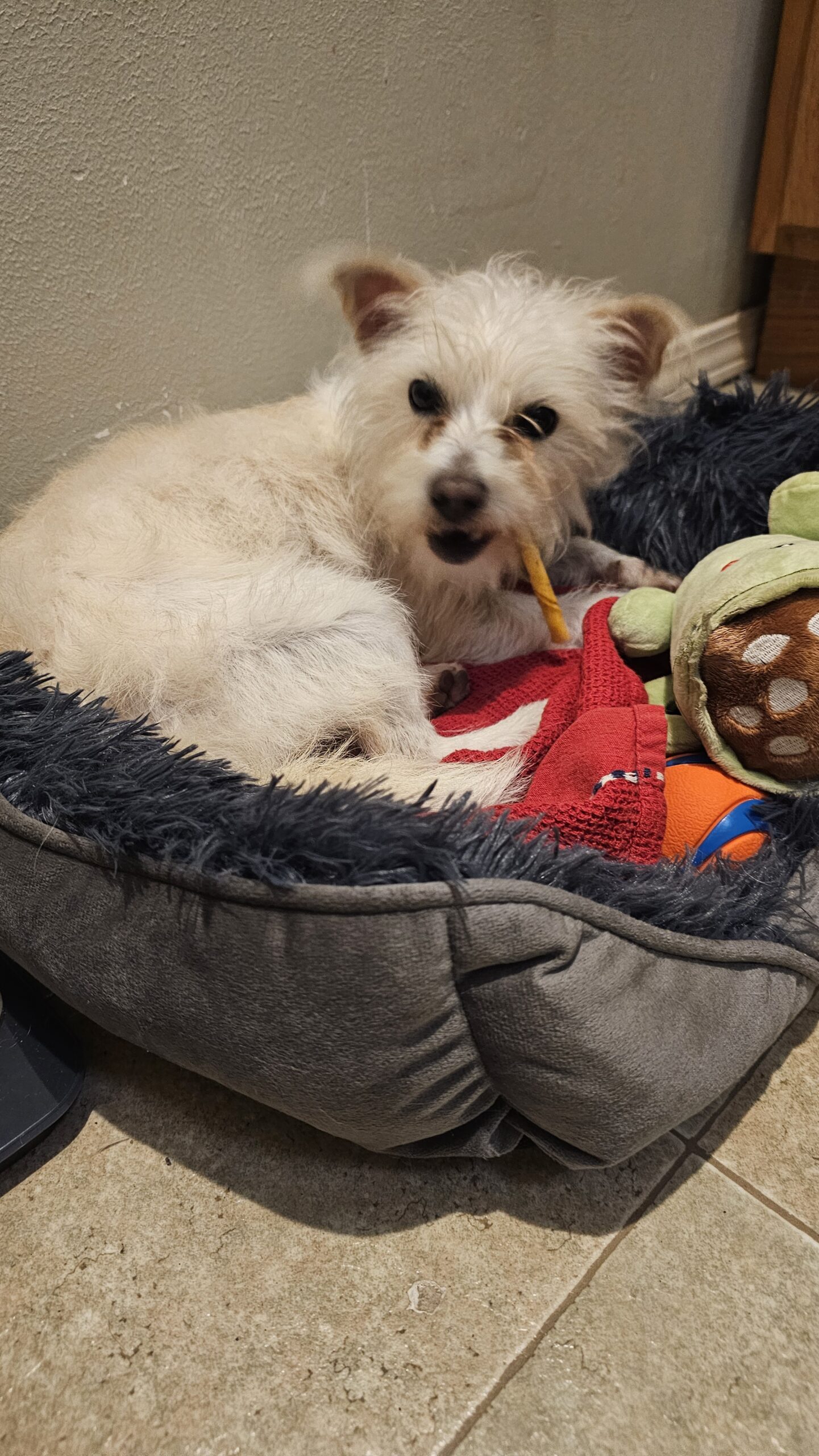 She is a cuddly little dog who loves to give affection. She has lots of energy but also loves to sit and cuddle. She is very young, around a year old. Has her vaccinations. She is not spayed but will need to be. She is learning new commands and how to walk on a leash and she is crate trained. She also does not potty in the house. She enjoys chew toys as she is still very young and likes to chew. She gets along well with other animals and has shown no aggression at all towards anyone or anything. I would recommend further training before she is left alone with other animals or in a house by herself, just because those things are still new to her. She can still be a little timid and loud noises or sudden movements tend to scare her just a bit. However, that doesn't last long and she warms up very quickly. She is very resilient and her personality is so friendly and playful. She will probably need an experienced adopter who will be able to help continue her training and has experience with stray animals and helping them gain their confidence. She is a huge love bug and just wants to be around people all the time. She is very smart and picks up things up very quickly. I am confident that she will make a wonderful, loving addition to someone's family.