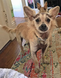 Ghost is really one of the sweetest pups, and melts into you like liquid, snuggling into your every curve and crevice. After fostering this little man, it makes total sense that the nickname for Chinese Cresteds are "velcro dogs". It may take a couple minutes to get to know you, then he is snuggled up in your lap. He adores being pet, and will stretch out and roll over so you can pet all the places. Ghost has been sleeping with me in my bed and enjoys being under the covers pressed against me, whether the crook of my knee or right at my belly. When he first got to my house, he was shy, didn't show interest in toys and was afraid of walking on a leash, especially on the city streets. In just a couple of days, he became very curious and playful. I don't think he was ever on a leash before I got him, but he went from scared to enthusiastic and inquisitive, and is constantly looking up at me for direction and praise. (Update, he just went on a long walk with two strangers (to him) and did a great job. I'm so proud ;-) He is very smart and food motivated so I think sky is the limit with training. He is not 100% potty trained yet, but is almost there. I've trained him to go on an astroturf patch on my deck, uses pee pads when I'm gone, and likes peeing on all the things on our walks. He is one of three boy dogs in my house (I'm keeping his brother) gets along well with all.